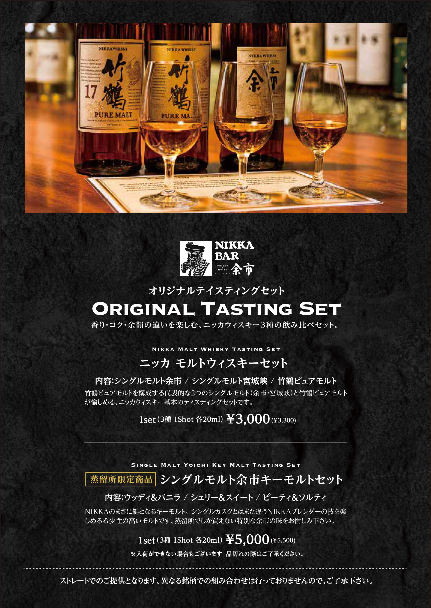 Tasting Set 余市のテイスティングセットは、 ウイスキーの香りや味わいの違いを、 じっくりと比べながら楽しんでいただくためのセットです。 同じ蒸溜所でも、 原酒や熟成の違いによって、 香りや余韻は大きく変わります。 ストレートで香りを感じ、 少しずつ味わいを確かめながら、 自分の好みを見つけていく。 初めての方にも、 ウイスキーを深く楽しみたい方にもおすすめの内容です。