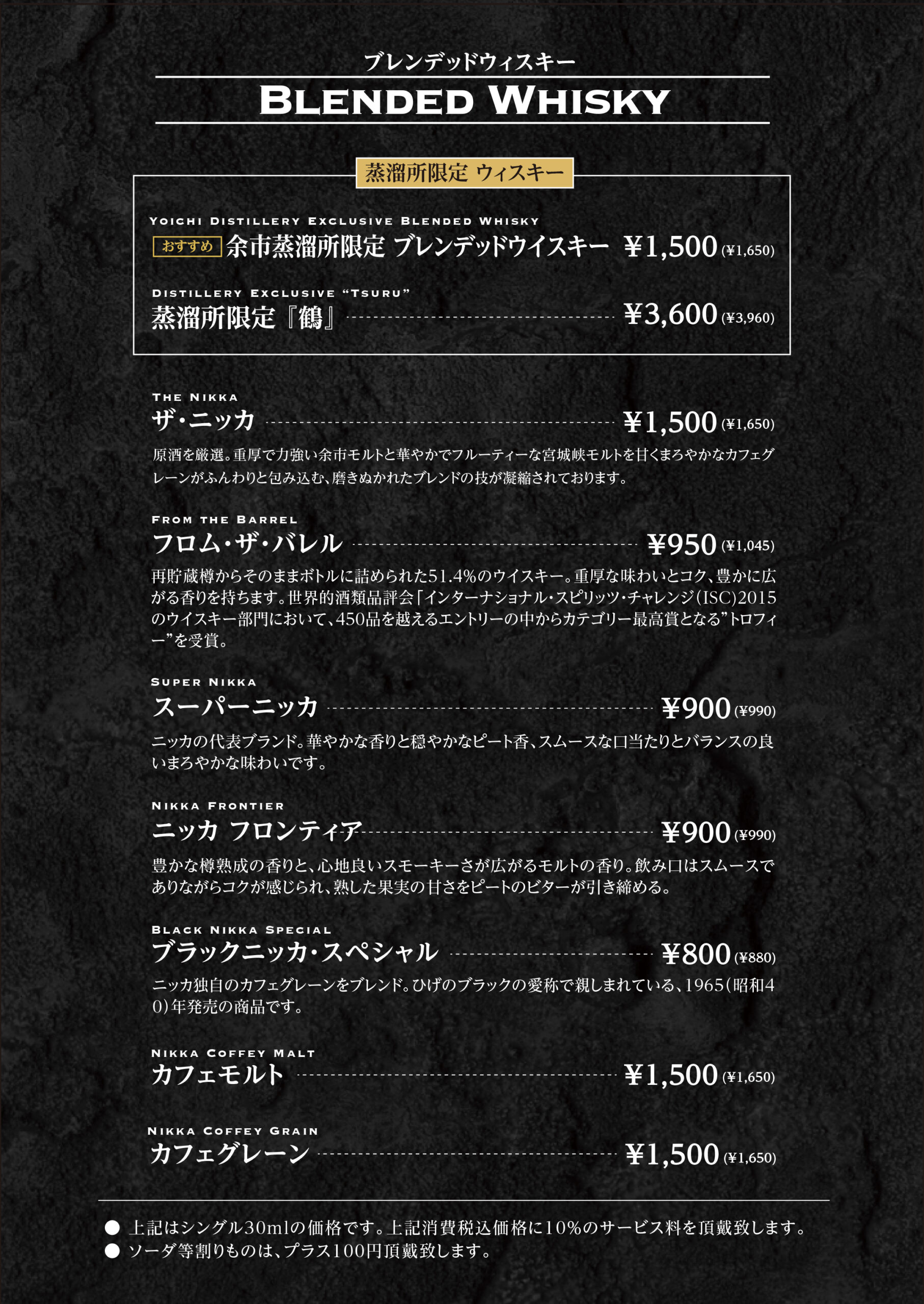 Whisky 余市では、 ニッカウヰスキーを中心に、 蒸溜所限定ボトルやキーモルト、 シングルモルト、ピュアモルト、 そしてブレンデッドウイスキーを取り揃えています。 石炭直火蒸溜ならではの力強さ、 樽由来の甘みやスモーキーな余韻。 それぞれの個性を、 音とともに静かに味わっていただけます。 ストレート、ロック、水割りなど、 お好みの飲み方でお楽しみください。